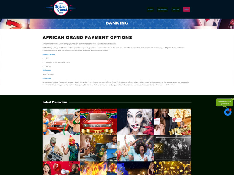 Deposits and withdrawals are safe, hassle-free and South African friendly. Besides that, players who deposit using their Visa cards will receive 180 Free Spins. There’s more if you deposit via EFT players receives a special cashback. Finally, African Grand only accepts one fiat currency: South African Rand (ZAR) and the cryptocurrency Bitcoin.